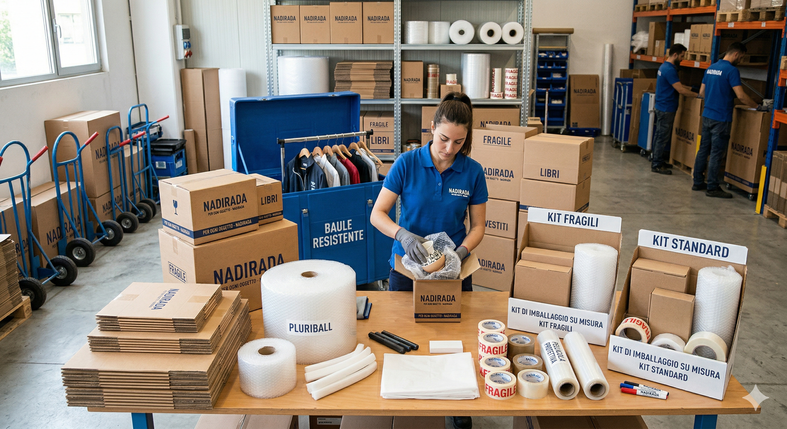 In NADIRADA sappiamo che un buon trasloco inizia dalla scelta dei materiali giusti. Per questo mettiamo a disposizione una dotazione completa di materiali da imballaggio professionali, selezionati con cura per rispondere a ogni tipo di esigenza. Scatole di ogni dimensione, bauli resistenti, nastri adesivi, pellicole protettive e pluriball: ogni materiale ha un ruolo preciso nella protezione dei tuoi oggetti. Per questo abbiamo sviluppato kit di imballaggio su misura, pensati per rispondere in modo preciso alle necessità di ciascun cliente. Che si tratti di oggetti fragili, mobili di grandi dimensioni o articoli di particolare valore, abbiamo la soluzione giusta per proteggere al meglio ciò che trasporti. Il nostro team seleziona il kit più adatto e prepara ogni pezzo con cura e professionalità, perché per noi ogni oggetto, grande o piccolo, merita la stessa cura e la stessa attenzione.